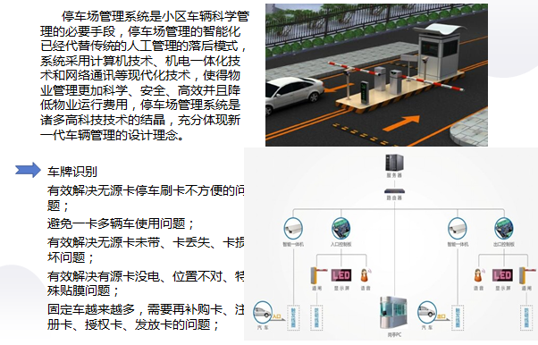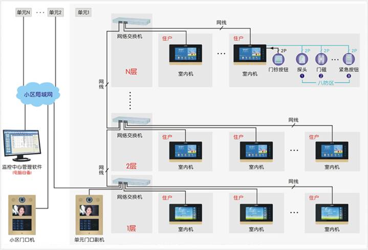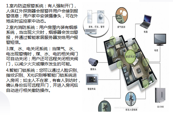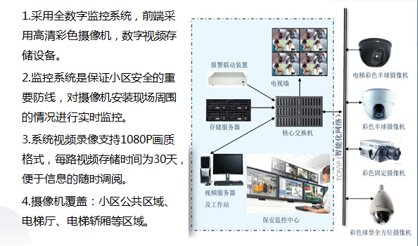 一、综合布线系统 综合布线系统是指按标准的、统一的、简单的结构化方式编制和布置建筑物内各种系统的通信线路。可包括网络、电话、视频、控制等系统的布线。 二、视频监控系统 三、有线电视系统 1.能接收数字电视系统的节目。 2.满足图像、声音、数据三网合一的HFC宽带综合业务网要求。 3.满足5-860MHz邻频双向传输方式。 四、背景音乐广播系统 智能小区背景音乐系统可以为小区营造一个轻松、舒适的生活环境。无论在小区的哪一个角落,都可以听到令人赏心悦目的音乐,这不仅提升了小区的档次和品位,更提高了生活质量。 1.安装位置:大堂、电梯厅、走廊、室外草坪。 2.安装方式:楼层吸顶安装,室外埋地安装。 3.选用技术:本系统选用IP广播系统。 五、无线巡更系统 无线巡更系统主要由:管理计算机、巡更棒、信息钮、通讯底座组成。巡更时安保人员用巡更棒在巡更线路上的信息钮进行数据采集,巡更结束后通过通讯底座将巡更棒内的信息采集到管理电脑中。 六、门禁系统 七、多媒体公共显示系统 多媒体显示系统是利用液晶显示屏将企业宣传、实时通知等全方位展现出来的一种高清多媒体显示技术。系统是将音视频、电视画面、图片、动画、文本、文档、网页、流媒体、数据库数据等组合成一段段精彩的节目,并通过网络将制作好的节目实时的推送到分布在各处的媒体显示终端,从而将精彩的画面、实时的信息全方位的展现在各种场所。 八、停车场管理系统 九、周界防范系统 沿小区周界围墙设置电子周界防范系统,针对各种闯入与误入园区的行为实施探测、报警、告知、吓阻、出警等安防措施。 电子周界防范系统沿围墙设置电子围栏,翻墙行为触碰电子围栏,联动现场声光警报、广播与视频监控实现吓阻功能,通过总线模块向报警主机报告相关信息,接受控制模块发来的指令以关闭声光警报信号与广播。 在监控中心内设置报警主机,通过RS485总线/IP网络/传输光纤等采集现场设备的报警、防拆、故障信号,具备布撤防操作功能、发布声光警报信号,通过报警联动模块实施现场视频安防联动、允许通过控制模块关闭现场声光警报,通知保安及时出警处理突发事件 设置原则:1)根据现场地形及围栏走向每50米设置1对。2)围栏上方支架安装高出围栏200mm。 十、访客登记管理系统 作为现代化的小区,来访客人众多,访客的登记管理非常重要,其不仅关系到小区的人员往来控制,避免安全隐患,同时作为对外窗口的一环,如何高效、安全管理的同时又尽显小区物业的文明是不可忽视的。为此,在小区的主要出入口处设置访客登记管理系统。 功能说明: 1.支持二代身份证电子识别和驾照的扫描OCR识别。 2.系统可以设置用户访问的区域、通过次数和时间。 3.可自定义访客单,访客单上可以打印条码。 4.若有用户超时未出,系统应具有提醒功能。 5.支持黑名单管理。 十一、访客可视对讲系统 在住宅单元门口安装具有电控门锁的安全防盗门和访客可视对讲门口主机,住宅内设置室内机,在小区主要出入口和监控中心(或小区安防值班室)配置管理机。对讲分级可实施远程开锁。 十二、远程自动抄表系统 电、水、煤气的户外监控及远程计量系统是采用计算机及其网络系统对使用中的电表、水表、煤气表进行智能化管理,实现了抄表自动化,并可随时对电表、水表、煤气表的使用进行监控、计量和计费。而且,通过与银行计算机系统联网,可以实现相关费用的收费自动化。 十三、智能家居安防系统 十四、电梯五方对讲 十五、智慧小区 1.灯光人体感应系统 2.车位指引智能化工程